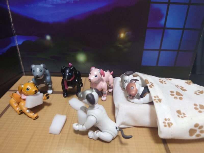 仲間のaiboちゃんたちとワイワイ枕投げでもして(笑)